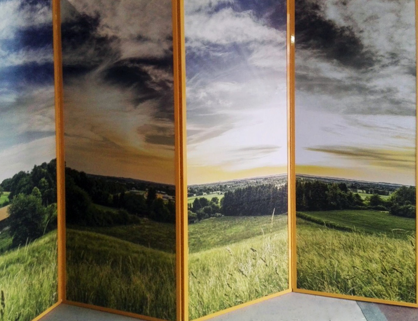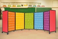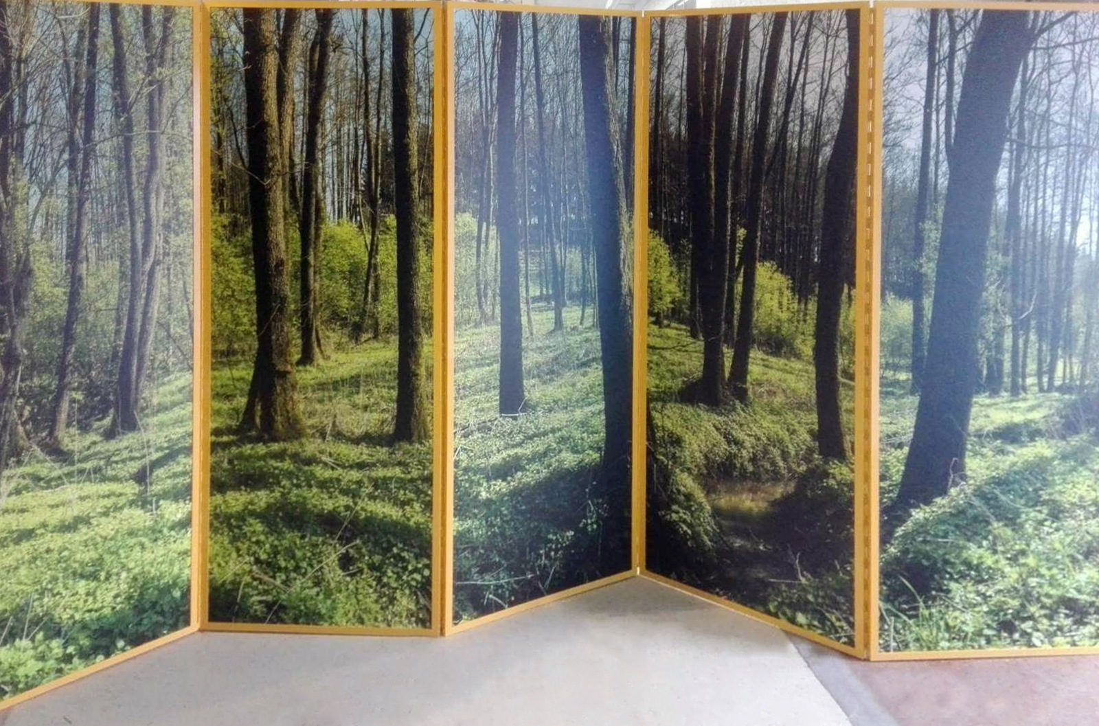 При создании ширмы возможно комбинирование панелей из различных материалов: пвх/сотопанелей с фотопечатью на пленке, сотопанелей с нанесением ткани, поликарбоната, а также установка магнитно-маркерной доски.