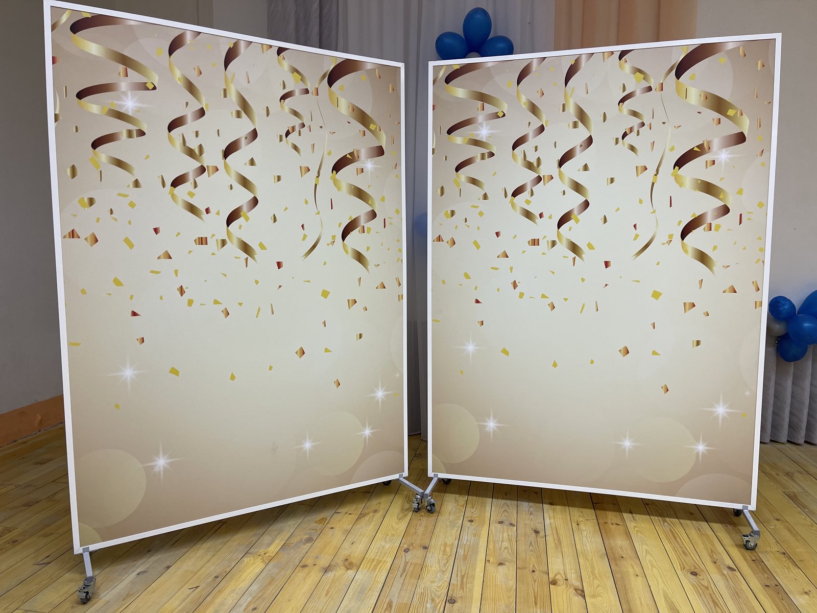 При создании ширмы возможно комбинирование панелей из различных материалов: пвх/сотопанелей с фотопечатью на пленке, сотопанелей с нанесением ткани, поликарбоната, а также установка магнитно-маркерной доски.