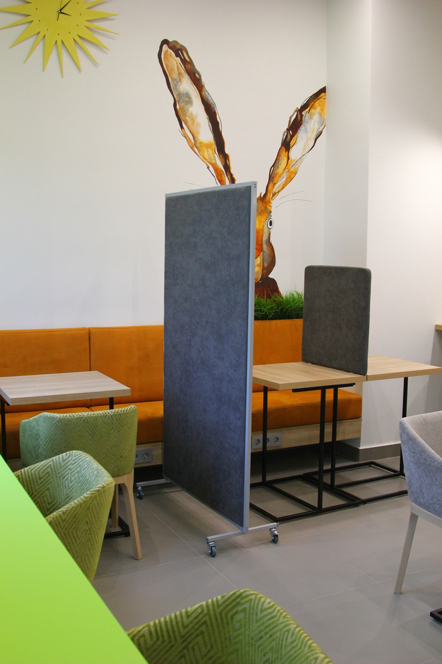При создании ширмы возможно комбинирование панелей из различных материалов: пвх/сотопанелей с фотопечатью на пленке, сотопанелей с нанесением ткани, поликарбоната, а также установка магнитно-маркерной доски.